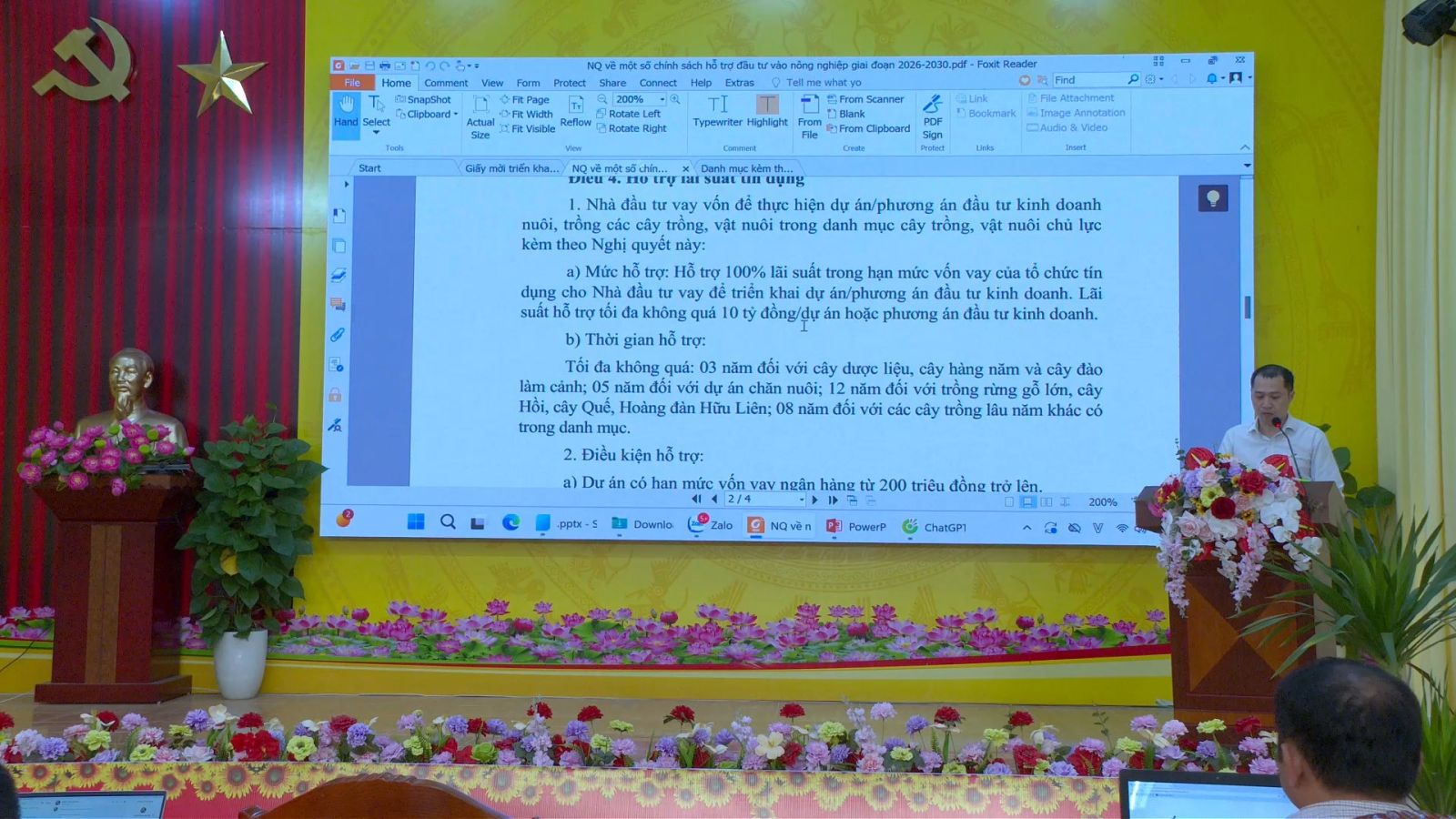 Tham dự hội nghị có lãnh đạo UBND xã, đại diện Ủy ban Mặt trận Tổ quốc Việt Nam xã, các tổ chức chính trị – xã hội, lãnh đạo các đơn vị chuyên môn, cùng bí thư chi bộ, trưởng thôn và trưởng ban công tác mặt trận các thôn. Đáng chú ý, các thôn đã chủ động lựa chọn và mời đại diện các hộ gia đình có khả năng đăng ký tham gia các chính sách hỗ trợ, thể hiện sự quan tâm và sẵn sàng của người dân trong việc tiếp cận cơ chế mới.