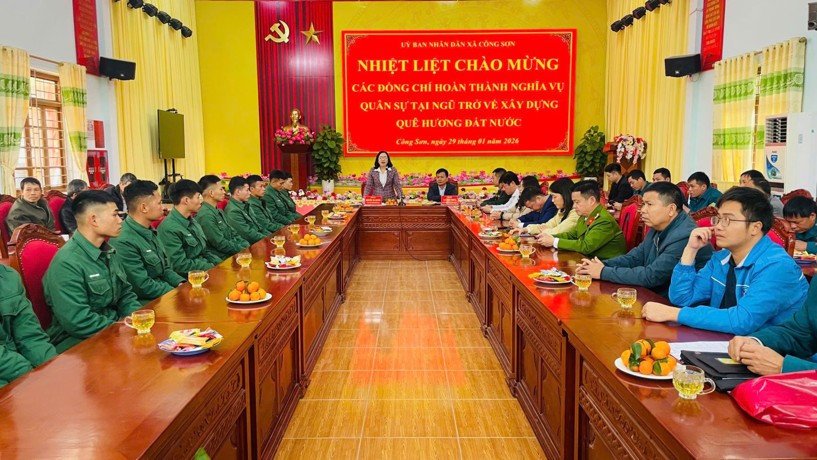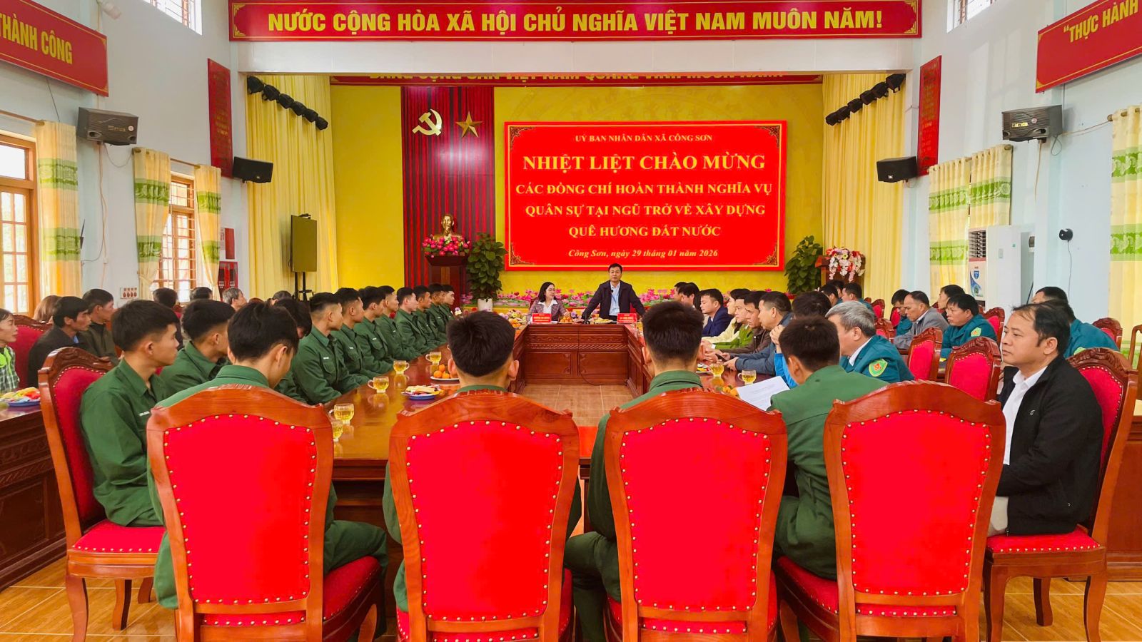 Sáng 29/1/2026, tại Nhà văn hóa xã Công Sơn, UBND xã Công Sơn long trọng tổ chức lễ đón và gặp mặt chúc mừng các quân nhân hoàn thành nghĩa vụ quân sự tại ngũ trở về địa phương. Đây là hoạt động có ý nghĩa chính trị – xã hội sâu sắc, thể hiện sự quan tâm của cấp ủy, chính quyền và Nhân dân địa phương đối với con em đã hoàn thành nhiệm vụ trong Quân đội nhân dân Việt Nam.Tham dự buổi lễ có lãnh đạo Đảng ủy, HĐND, UBND xã; Ủy ban MTTQ Việt Nam xã; các thành viên Hội đồng Nghĩa vụ quân sự xã; Ban Chỉ huy Quân sự xã; đại diện các tổ chức chính trị – xã hội, trưởng thôn, thôn đội trưởng các thôn trên địa bàn xã cùng đông đảo gia đình các quân nhân xuất ngũ.