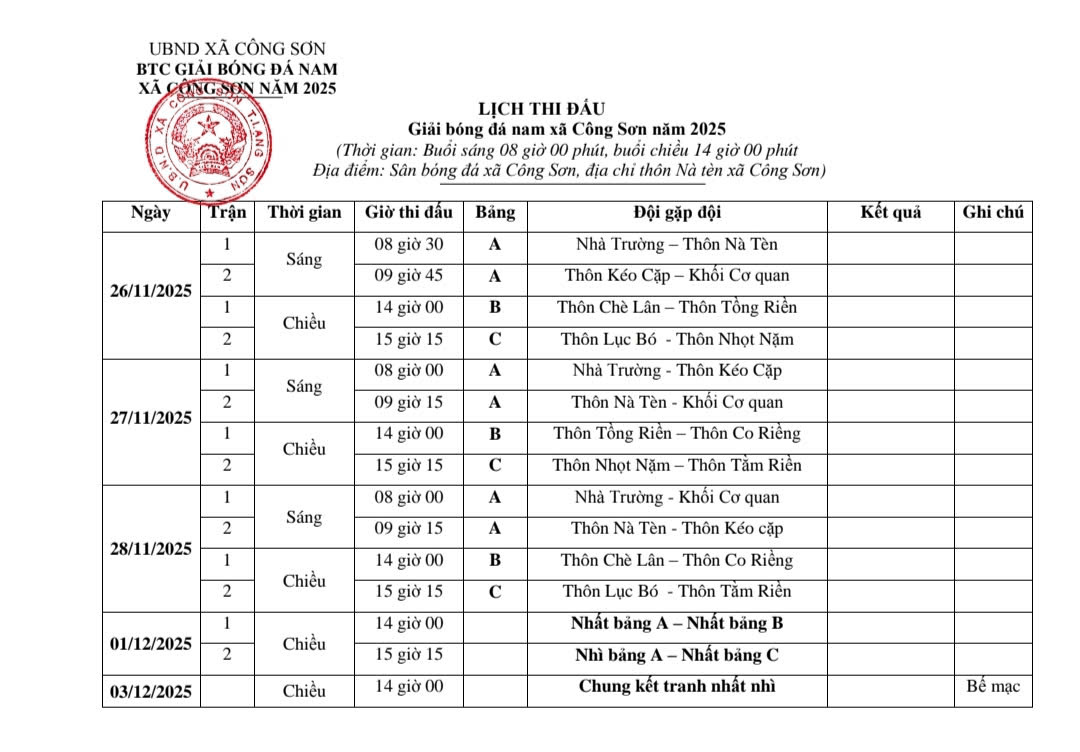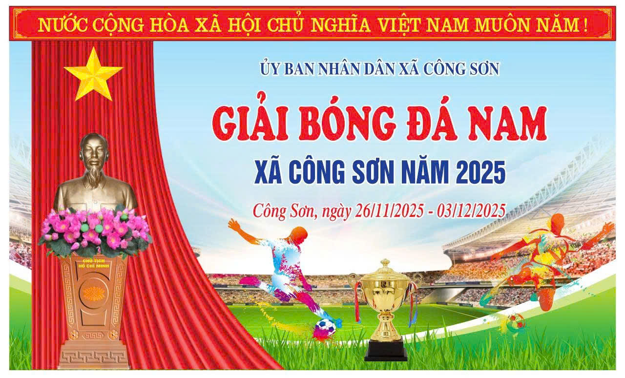 Từ ngày 26/11/2025 đến 03/12/2025, xã Công Sơn tổ chức Giải bóng đá Nam năm 2025 với sự tham gia của 10 đội đến từ các thôn, các cơ quan, đơn vị trên địa bàn xã ⚽