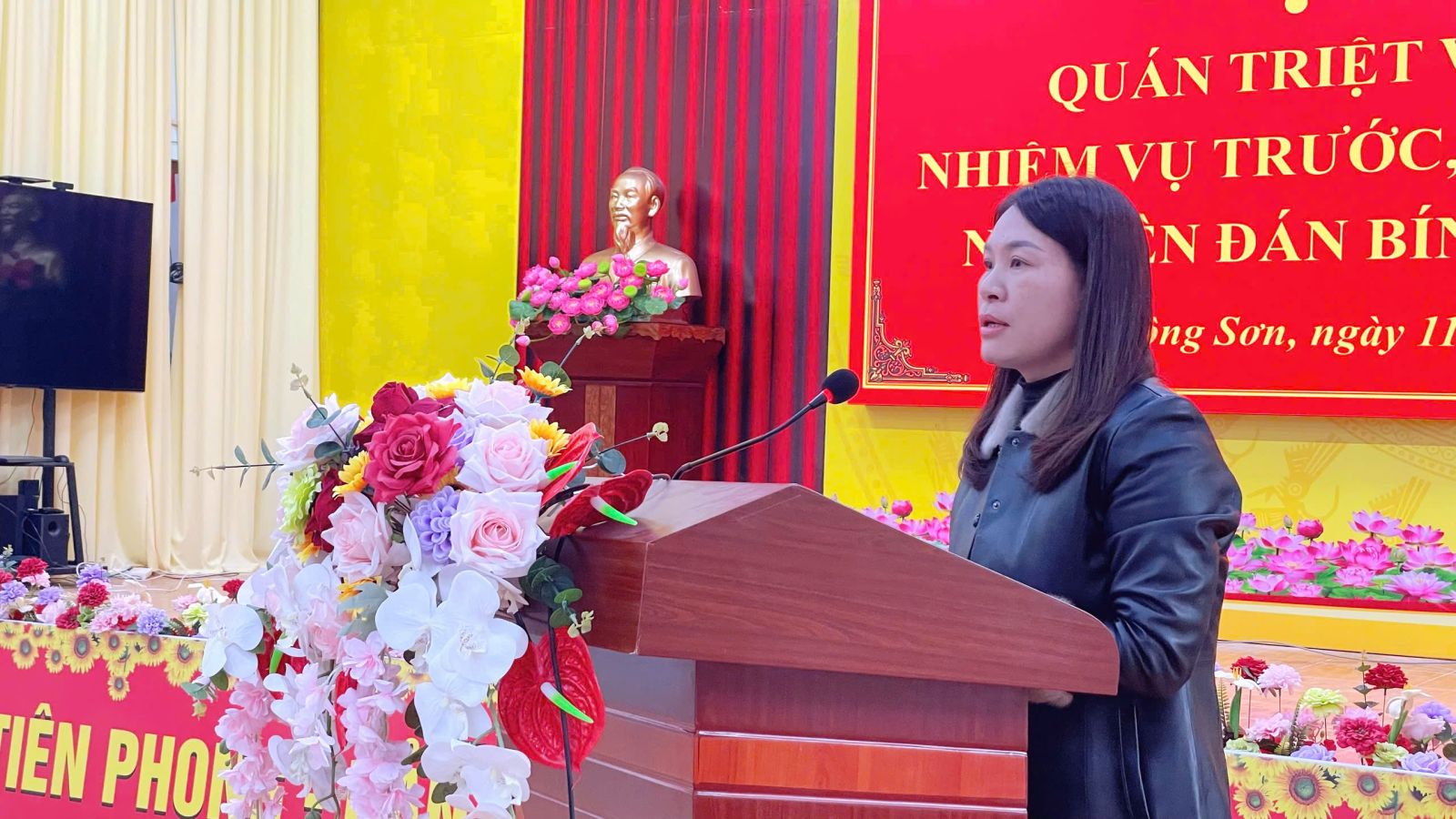 Đồng chí Tôn Bích Thảo, Phó Chủ tịch UBND xã, báo cáo tình hình chuẩn bị Tết Nguyên đán Bính Ngọ 2026 tại hội nghị.