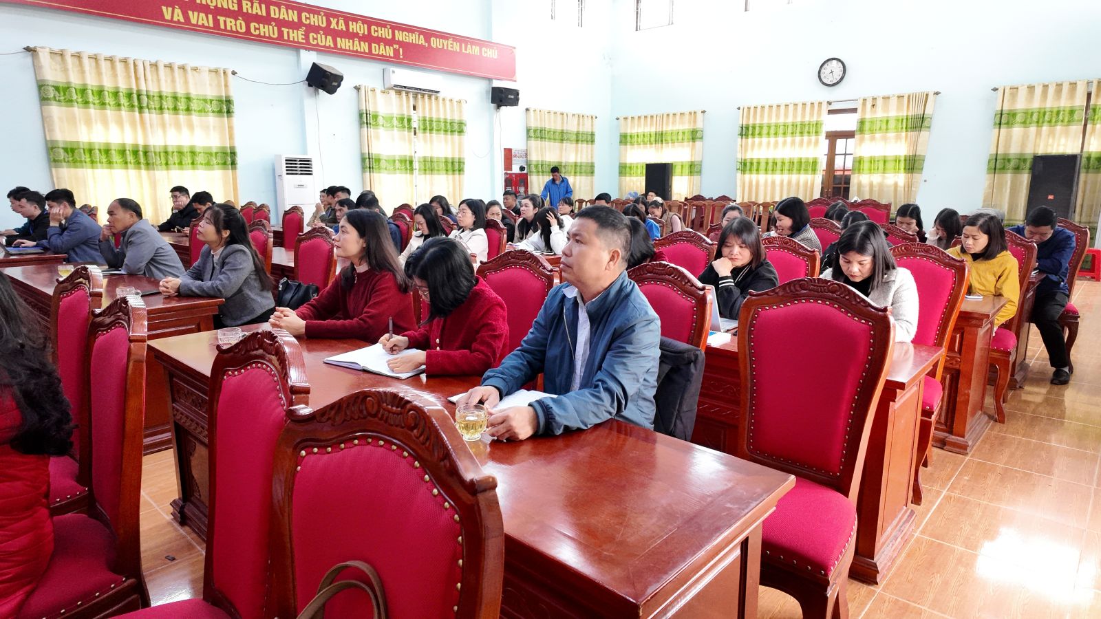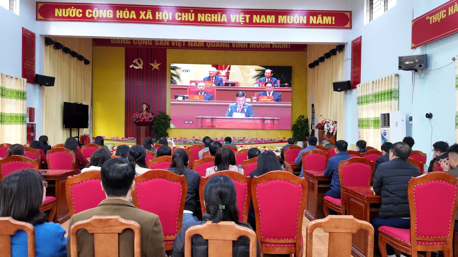 Cán bộ, công chức xã Công Sơn tham dự trực tuyến Lễ Khai mạc Đại hội đại biểu toàn quốc lần thứ XIV của Đảng tại Nhà văn hóa xã.