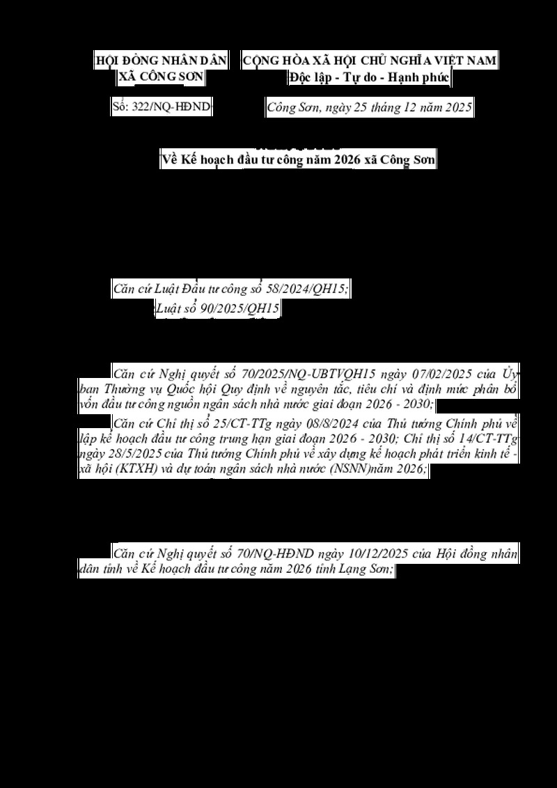 Nghị quyết về Kế hoạch đầu tư công năm 2026 xã Công Sơn
